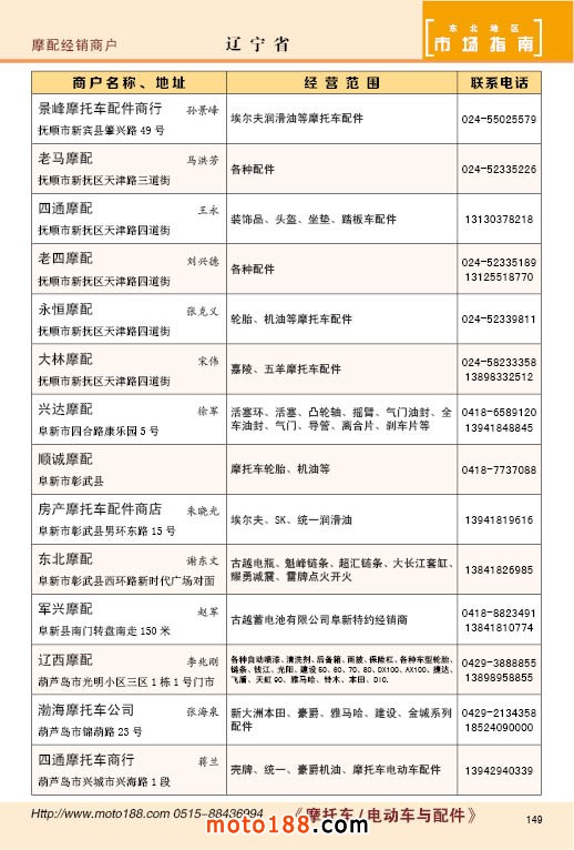 中国摩配市场从上世纪九十年代开始经过高速度的发展,正逐步减速,摩托车行业也渐呈式微,与之紧密相关的后市场的配件与维修也呈逐步下滑之势,取代摩托车的在发达地区是汽车,欠发达地区是电动两轮、电动三轮,甚至电动四轮车,随着经济的发展,出行的多样化,也给了消费者多重的选择。目前现有的摩托车及配件市场,也不再是以纯摩托车为主体,有的市场电动车取代了摩托车,有的商店也是混合经营,这些变化在《市场指南》里面都有所反应。这次《北方指南》一些小市场不再单列,并入到相应的省份中去;以前去市场的公交线路,书中也不再列入,因为现在的地图导航功能十分强大,既新又准。