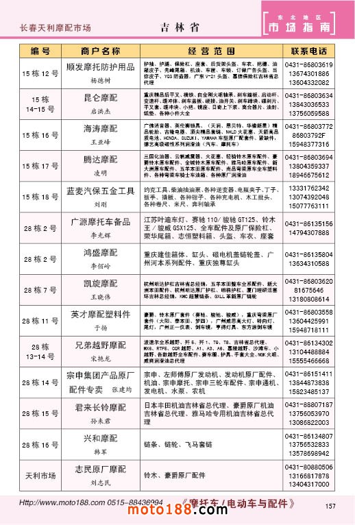 中国摩配市场从上世纪九十年代开始经过高速度的发展,正逐步减速,摩托车行业也渐呈式微,与之紧密相关的后市场的配件与维修也呈逐步下滑之势,取代摩托车的在发达地区是汽车,欠发达地区是电动两轮、电动三轮,甚至电动四轮车,随着经济的发展,出行的多样化,也给了消费者多重的选择。目前现有的摩托车及配件市场,也不再是以纯摩托车为主体,有的市场电动车取代了摩托车,有的商店也是混合经营,这些变化在《市场指南》里面都有所反应。这次《北方指南》一些小市场不再单列,并入到相应的省份中去;以前去市场的公交线路,书中也不再列入,因为现在的地图导航功能十分强大,既新又准。