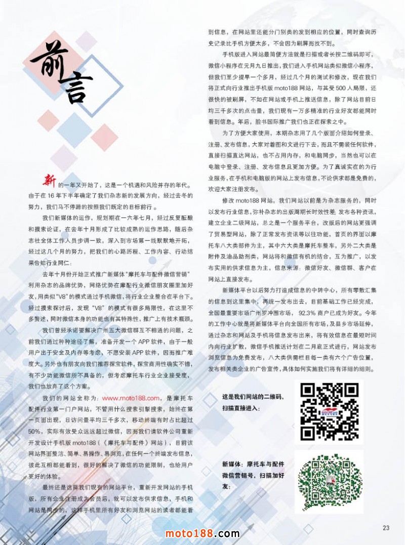 我们的网站全称为:www.moto188.com,是摩托车配件行业第一门户网站,不管用什么搜索引掣搜索,始终在第一页面出现,日访问量平均三千多次,移动终端有时占比超过50%,实际有效受众远远超过微信,因而我们请软件公司重新开发设计手机版moto188(《摩托车与配件》网站),目前该网站界面整洁、简单、易操作、易浏览,在任何一个终端发布信息,彼此互相都能看到,很好的解决了微信的功能限制,也给用户更好的体验。