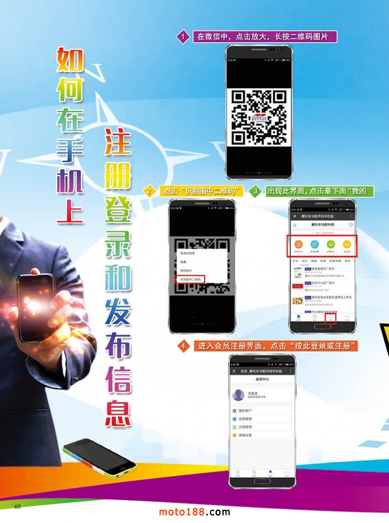 手机版进入网站最简便方法就是扫描或者长按二维码即可,微信小程序在元月九日推出,我们进入手机网站类似微信小程序,但我们至少提早一个多月,经过几个月的测试和修改,现在我们将正式向行业推出手机版moto188网站,与其受500人局限,还很快的被刷屏,不如在网站或手机上推送信息,除了网站目前日均三千多次的点击量,我们现有一万多精准的行业好友都能同时看到信息。年后,脸书国际推广我们也正在探索之中。
