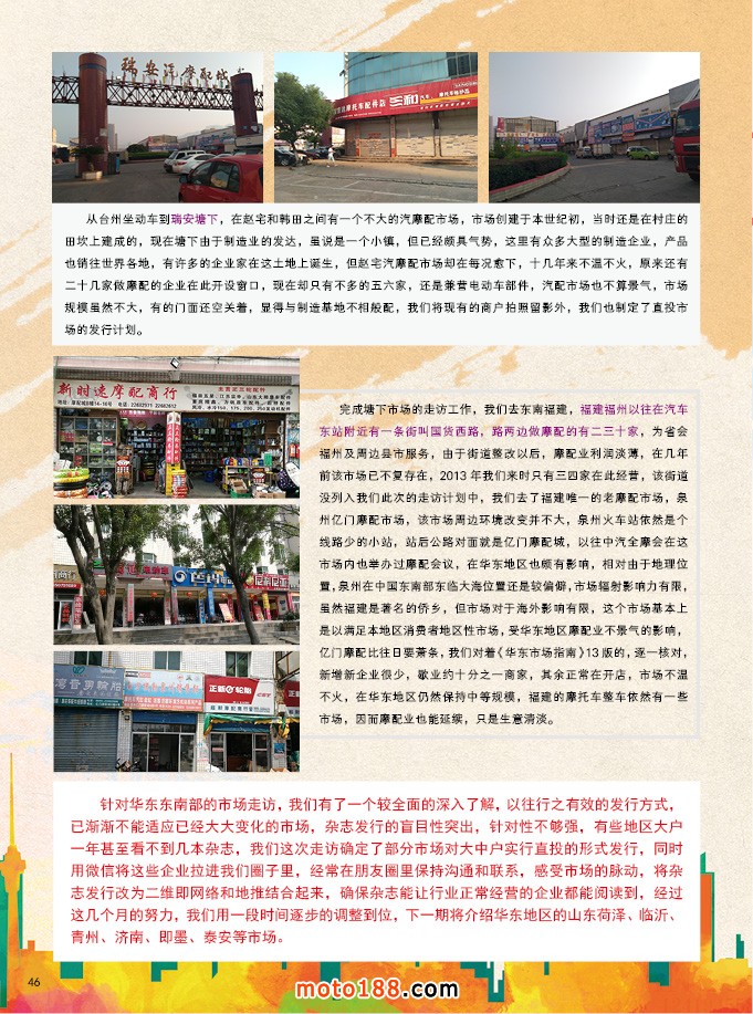 《外贸市场指南》发行对象:在广州秋季全摩会首发,在明年春季全摩会继续发行,全国所有的外贸企业、外商、全国所有的外贸摩配市场,目前需要在《中国摩配外贸市场指南》上做宣传的企业十分踊跃,从计划推出到正式操作不到一个月,已订出一百五十个版面,我们争取精心制作,确保准确性和适用性,将国内第一本外贸商业工具书做好。