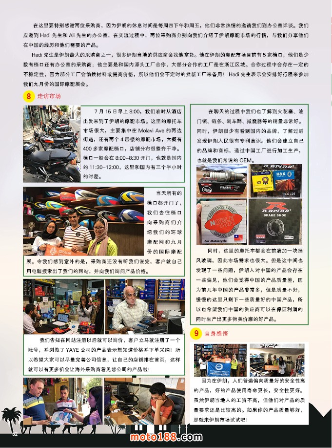 今年十一月份中汽全摩会继续在广州召开,为了做好外贸服务工作,抓住一带一路走向世界的发展契机,我们将我们的外贸数据库整理发布给业内人士,在广州全摩会正式推出首版《中国摩配外贸市场指南》,用中英文双语出版,正度16开,尺寸为266×181毫米。