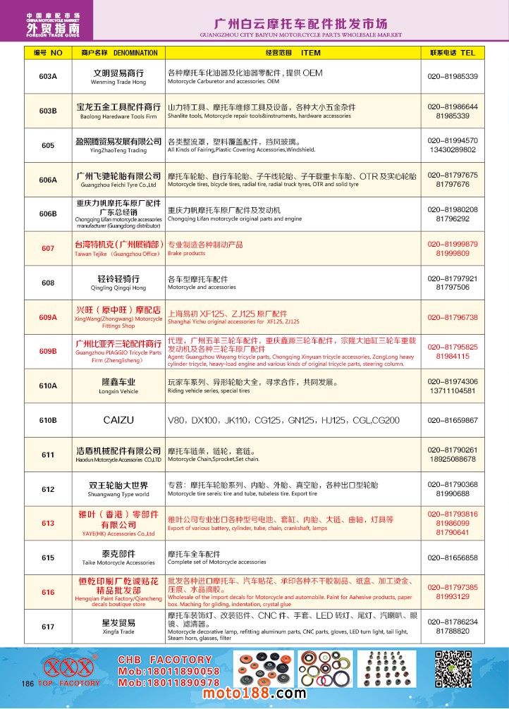 由《摩托车与配件》杂志社,在国内首次独家推出的《中国摩托车配件外贸市场指南》工具书正式面世。这是一本专业定位于外贸企业的工具书,随着一带一路发展战略的推进,更多企业走出国门,将产品销往世界各地,本书收集了国内主要从事摩托车配件外贸的工厂、商家、国外部分驻华采购机构等资料汇总而成.