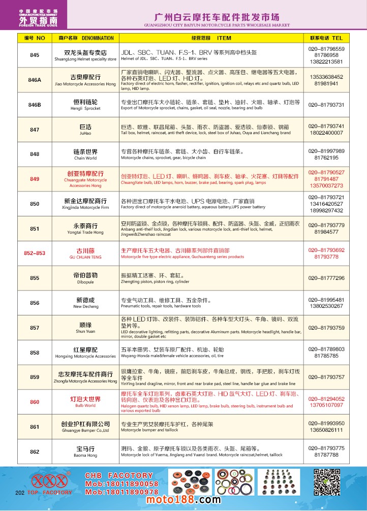由《摩托车与配件》杂志社,在国内首次独家推出的《中国摩托车配件外贸市场指南》工具书正式面世。这是一本专业定位于外贸企业的工具书,随着一带一路发展战略的推进,更多企业走出国门,将产品销往世界各地,本书收集了国内主要从事摩托车配件外贸的工厂、商家、国外部分驻华采购机构等资料汇总而成.