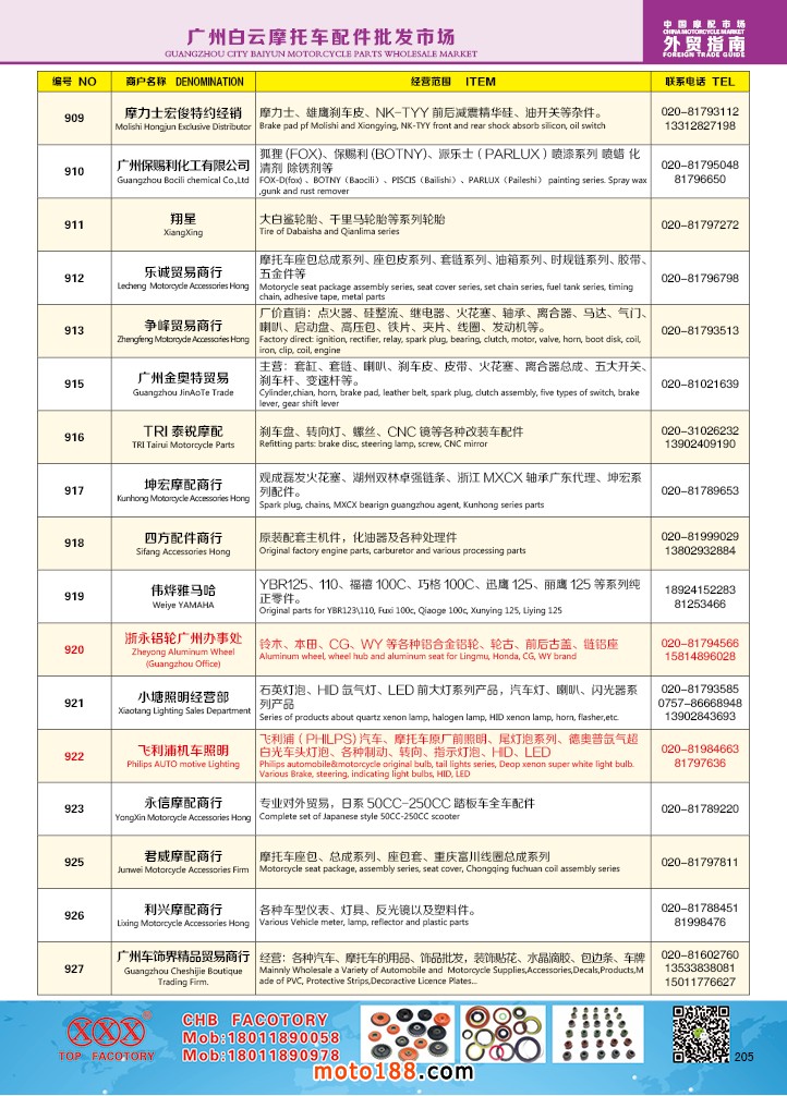 由《摩托车与配件》杂志社,在国内首次独家推出的《中国摩托车配件外贸市场指南》工具书正式面世。这是一本专业定位于外贸企业的工具书,随着一带一路发展战略的推进,更多企业走出国门,将产品销往世界各地,本书收集了国内主要从事摩托车配件外贸的工厂、商家、国外部分驻华采购机构等资料汇总而成.