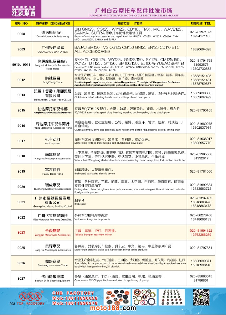 由《摩托车与配件》杂志社,在国内首次独家推出的《中国摩托车配件外贸市场指南》工具书正式面世。这是一本专业定位于外贸企业的工具书,随着一带一路发展战略的推进,更多企业走出国门,将产品销往世界各地,本书收集了国内主要从事摩托车配件外贸的工厂、商家、国外部分驻华采购机构等资料汇总而成.
