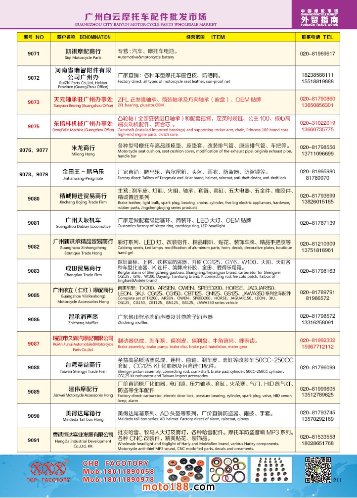 由《摩托车与配件》杂志社,在国内首次独家推出的《中国摩托车配件外贸市场指南》工具书正式面世。这是一本专业定位于外贸企业的工具书,随着一带一路发展战略的推进,更多企业走出国门,将产品销往世界各地,本书收集了国内主要从事摩托车配件外贸的工厂、商家、国外部分驻华采购机构等资料汇总而成.