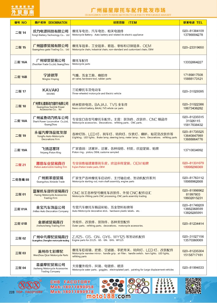 由《摩托车与配件》杂志社,在国内首次独家推出的《中国摩托车配件外贸市场指南》工具书正式面世。这是一本专业定位于外贸企业的工具书,随着一带一路发展战略的推进,更多企业走出国门,将产品销往世界各地,本书收集了国内主要从事摩托车配件外贸的工厂、商家、国外部分驻华采购机构等资料汇总而成.
