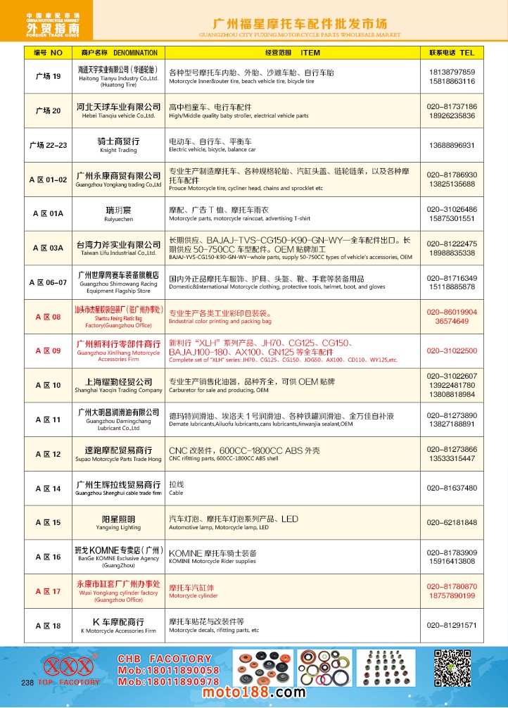 由《摩托车与配件》杂志社,在国内首次独家推出的《中国摩托车配件外贸市场指南》工具书正式面世。这是一本专业定位于外贸企业的工具书,随着一带一路发展战略的推进,更多企业走出国门,将产品销往世界各地,本书收集了国内主要从事摩托车配件外贸的工厂、商家、国外部分驻华采购机构等资料汇总而成.