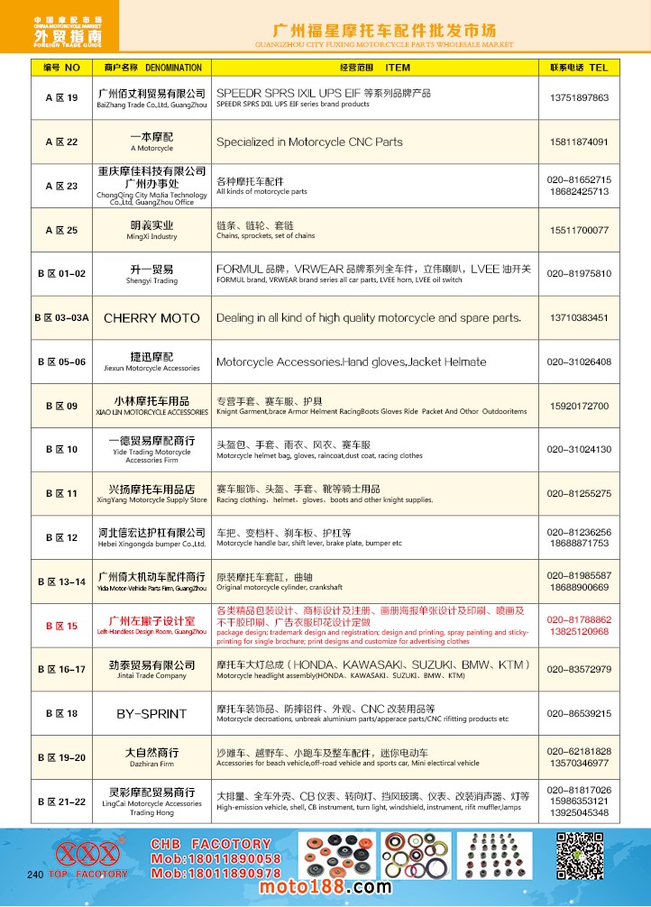 由《摩托车与配件》杂志社,在国内首次独家推出的《中国摩托车配件外贸市场指南》工具书正式面世。这是一本专业定位于外贸企业的工具书,随着一带一路发展战略的推进,更多企业走出国门,将产品销往世界各地,本书收集了国内主要从事摩托车配件外贸的工厂、商家、国外部分驻华采购机构等资料汇总而成.