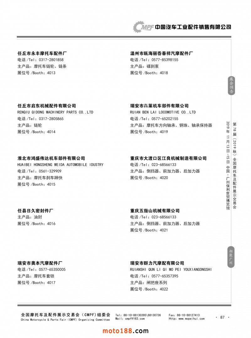 内87 第77届(2019春)全国摩托车及配件展示交易会-青岛站参展企业信息