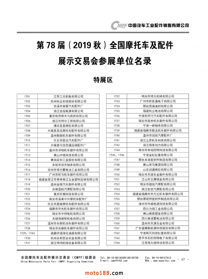 内67-78 第78届(2019秋)全国摩托车及配件展示交易会-广州站参展单位名录