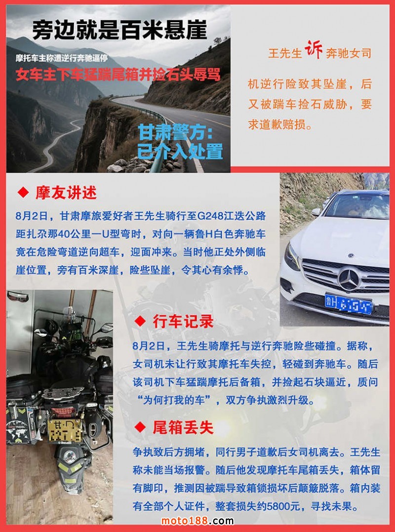 内8 旁边就是百米悬崖摩托车主称遭逆行奔驰逼停女车主下车猛踹尾箱并捡石头辱骂甘肃警方已介入处置