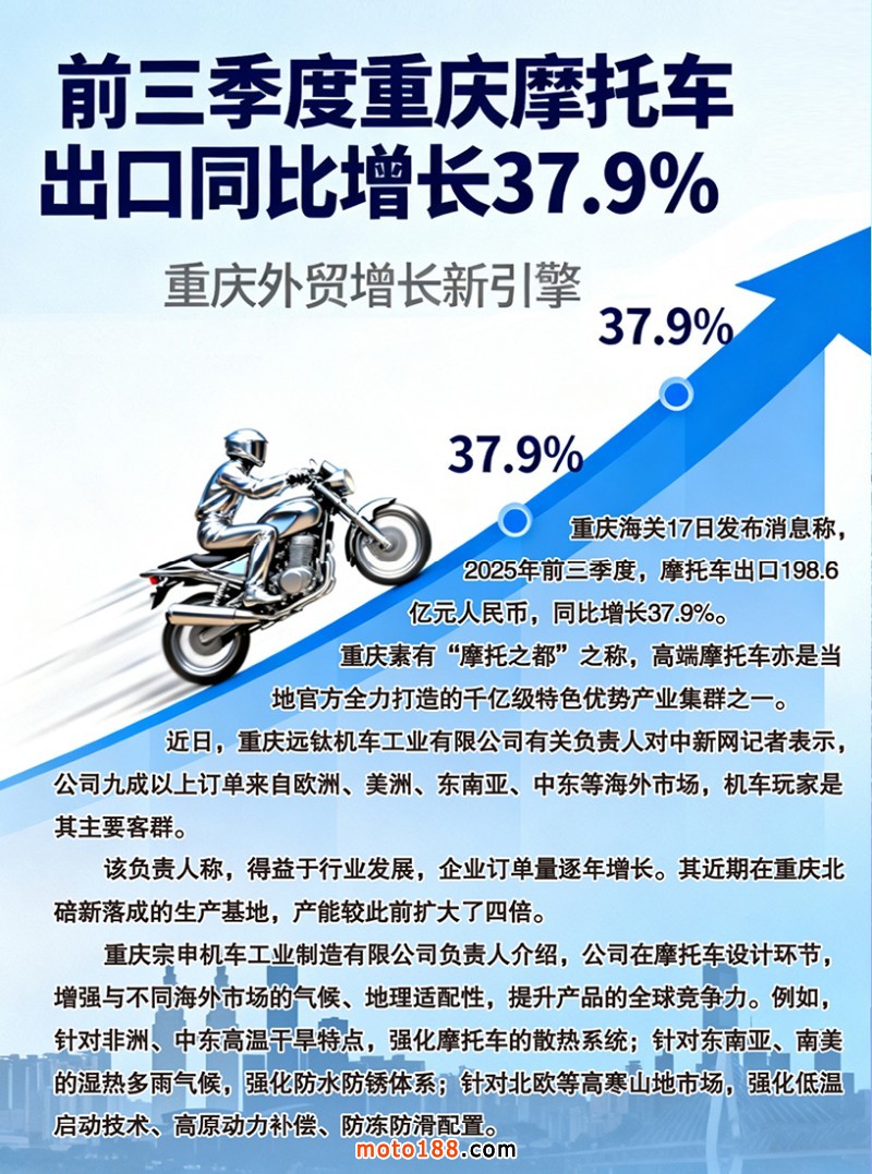 内1 前三季度重庆摩托车出口同比增长37.9%