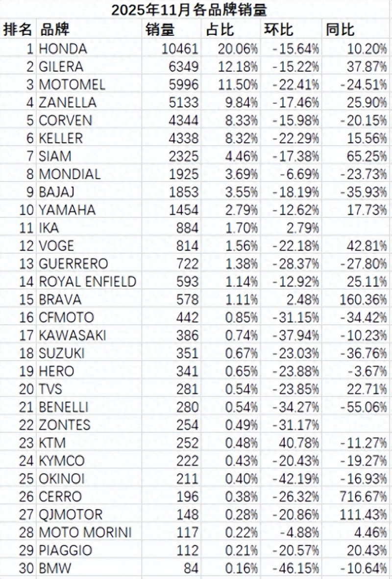 各品牌销量中,11月单月销量排名第一的依然是本田,销量10461辆,市场占有率为20.06%,同比增长10.2%,环比减少15.64% ;排名第二的是Gilera,6349辆,同比上升37.87%,环比降低了15.22% ; Motomel 以5996辆的成绩紧随其后同比下降了24.51% ,环比降低了22.41%。