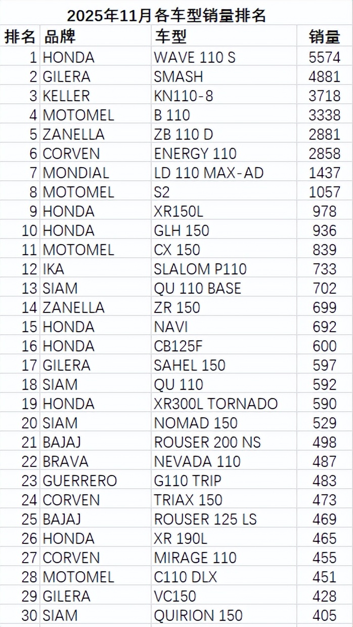 今年11月销量最好的车型仍是本田的WAVE 110 S,销量是5574辆;Gilera Smash本月销量4881辆,位居第二。